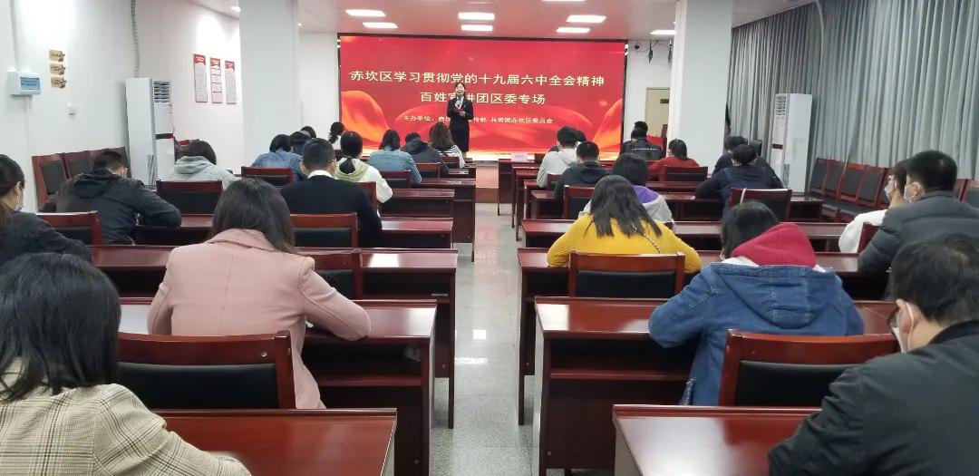 为了深入学习宣传贯彻习近平总书记在党的十九届六中全会上的重要讲话精神和全会精神,引导团干部、团员青年深入学习领会党的十九届六中全会重大意义和精神内涵,从党的奋斗历史中坚定信仰、振奋力量,1月7日上午,共青团赤坎区委联合赤坎区委宣传部举办赤坎区学习贯彻党的十九届六中全会精神百姓宣讲团区委专场活动。宣讲活动邀请了赤坎区十九届六中全会精神百姓宣讲团作宣讲。赤坎区各街道团工委新任班子近50人参加了活动。