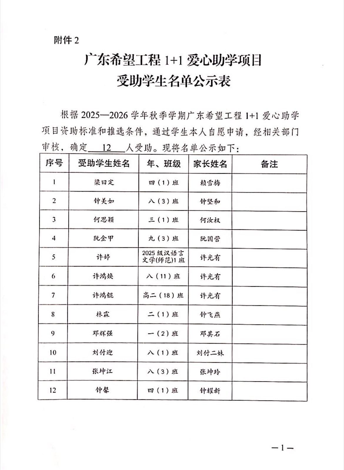 根据2025—2026学年秋季学期广东希望工程1+1爱心助学项目资助标准和推选条件,通过学生本人自愿申请,经相关部门审核,确定 12 人受助。现将名单公示如下: